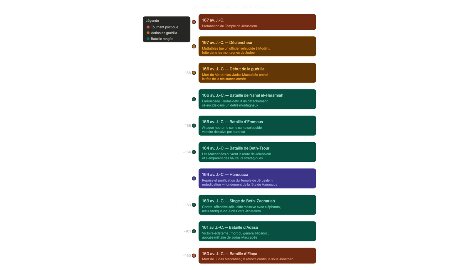 Sources : 1er Livre des Maccabées, 2e Livre des Maccabées, Polybe et analyses historiques modernes. Les chiffres séleucides sont souvent exagérés, les sources doivent être systématiquement vérifiées.